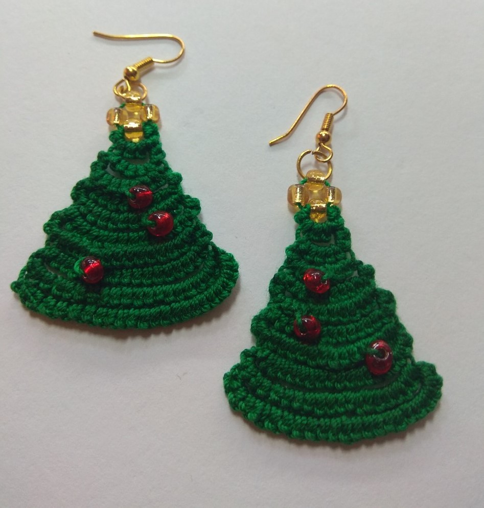 Frivoli technikával készült fülbevaló, karácsonyi csillogással.