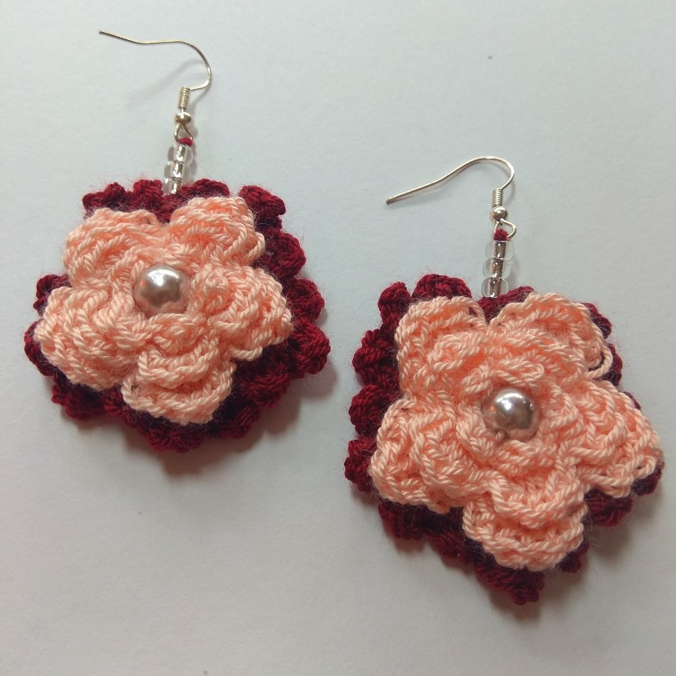 Horgolt fülbevaló,bordó és barack színű szirmokkal, közepén gyönggyel.